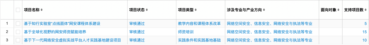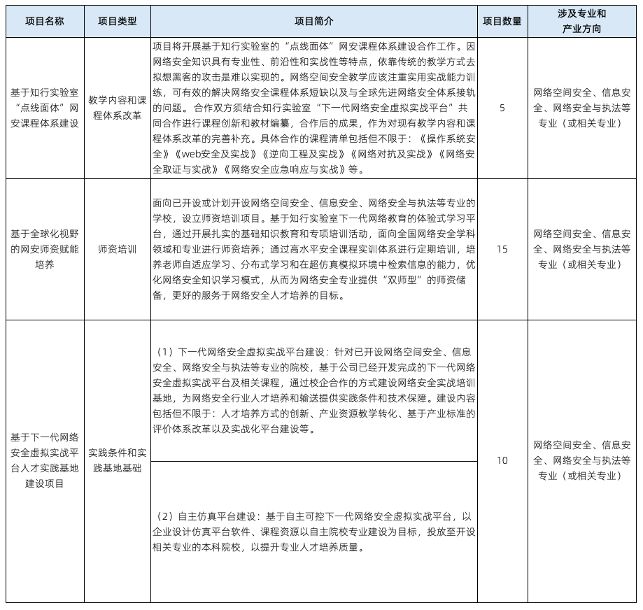 教学内容和课程体系改革、师资培训及实践条件和实践基地基础三个方面共计30个项目建设,深入推进校企双方产学合作、协同育人工作,并积极推广校企合作建设成果,增强优质教育资源的利用效率,助力高校教育教学改革和适应新时代、新经济、新技术的发展需求;为培养高素质、精专业、可实战的网络空间人才,打通理论学习到实习、实战的最后一公里,打造具有中国特色的网络人才培养新生态;推动学科建设、人才培养、理论创新、技术突破和应用示范全方位发展,为打造新型发展强国战略提供实践支撑。