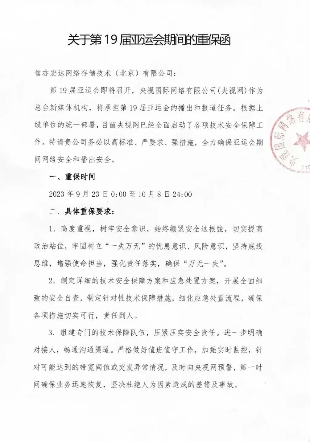 在9月23日0:00至10月8日24:00亚运会期间,信亦宏达有幸成为央视网的网络安保任务的重要合作伙伴,并以高标准、严要求、强措施,为央视网提供了全方位、多层次的网络安保服务,全力确保了央视网的网络安全和播出安全。