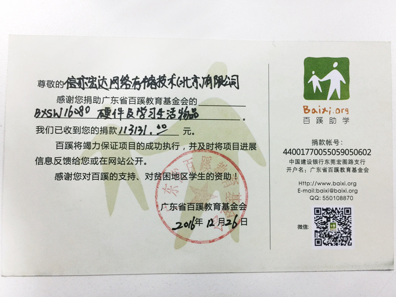 2016年12月底,已和教育局相关负责人确认,所有采购物品已到达四川布拖县,目前第一批物品已发放完毕,储物箱和储物架已经分配到宿舍和学生手里,电视机由于临近放假,暂时放在老师办公室保管,将与其他后续物资一起于春季开学后安装。