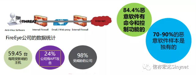目前数以百万计的新变种病毒,蠕虫和木马正在逐渐绕过传统的基于签名的安全解决方案,传统的”防御”手段不足以应对现今的高级威胁,不断变化的威胁需要一个新的防御模式