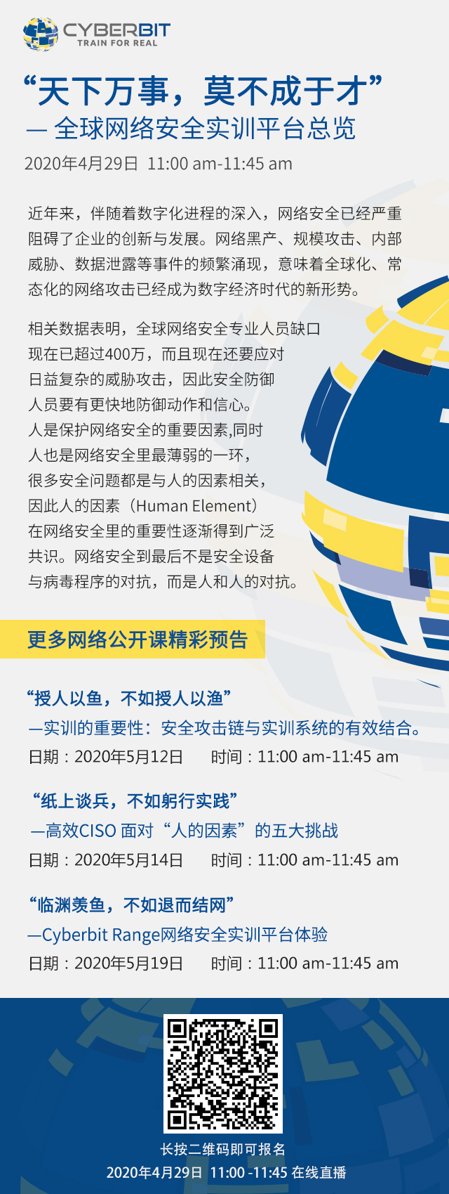 Cyberbit作为全球领先的安全解决方案提供商深谙行业痛点,特将组织开展“人的因素” 系列网络公开课,从业界最新安全技术内容及旗下Cyberbit Range网络安全培训和模拟平台介绍等方面,帮助企业了解如何打造一支专业的网络安全团队!