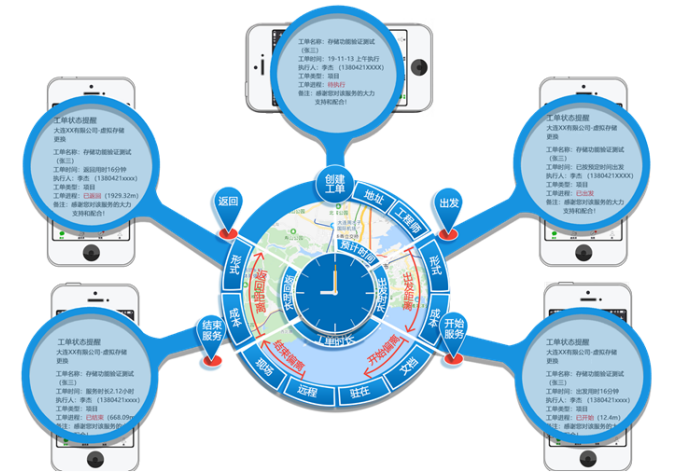 客户如遇到业务问题,可直接在线进行现场、驻场、文案等定制化工单的派发,我们将第一时间安排工程师进行解决。客户在后台能随时查看到工程师的工作轨迹、工作内容,有效监督工作情况。自定义的可视化体验,让服务更加智能、更加灵活。
