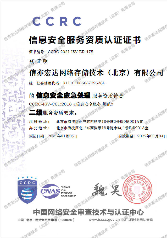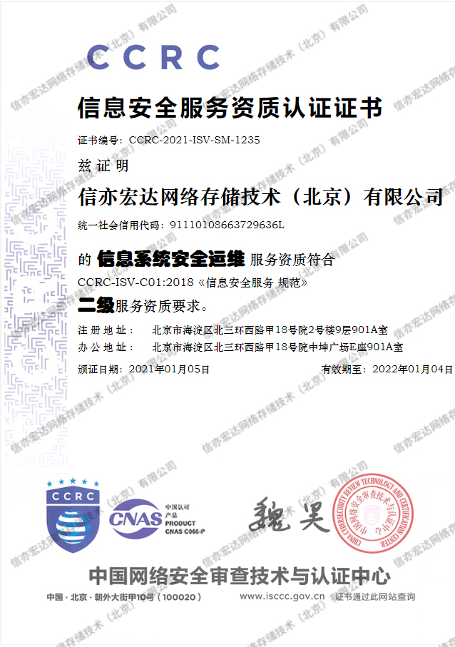 新年伊始,信亦宏达继获得高新技术企业证书之后,于1月5日顺利通过中国网络安全审查技术与认证中心(CCRC)的层层审核并获得其颁发的 “信息安全服务资质认证证书”!证书类别为信息安全应急处理服务及信息系统安全运维服务(二级资质)。
