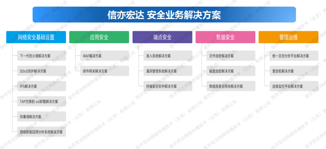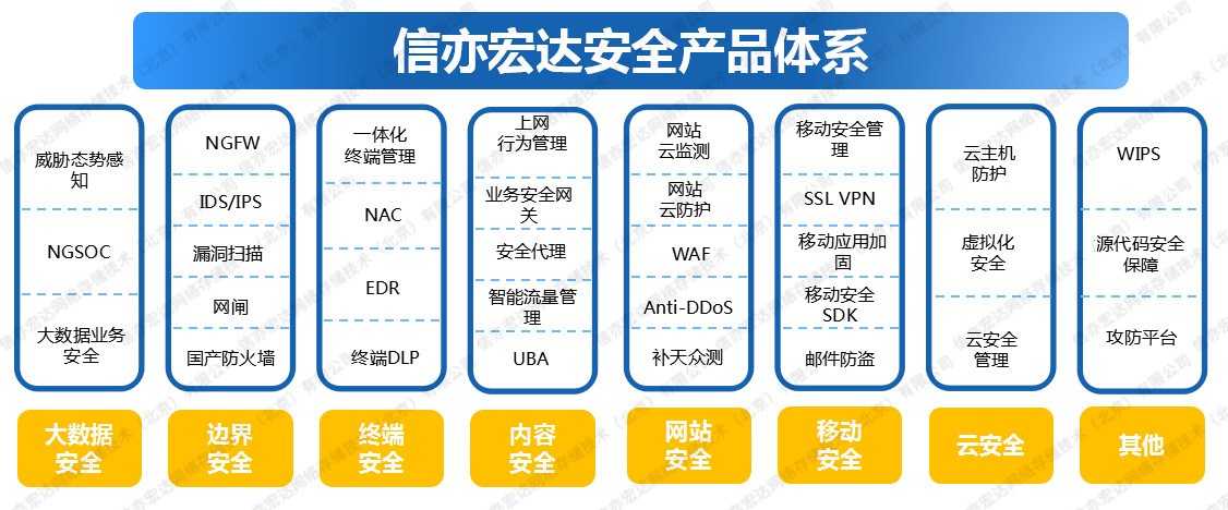 “信息安全服务资质认证”是国内最重要的安全服务资质之一,反映了信息安全服务提供者从事信息安全服务的保障能力和成熟程度。信亦宏达在十余年的经营中,已经形成了全面、丰富的安全产品体系,并设有专门的安全产品部,与数十家国内外技术领先的安全产品供应商建立了广泛的业务合作关系,可全面满足企业信息安全需求。