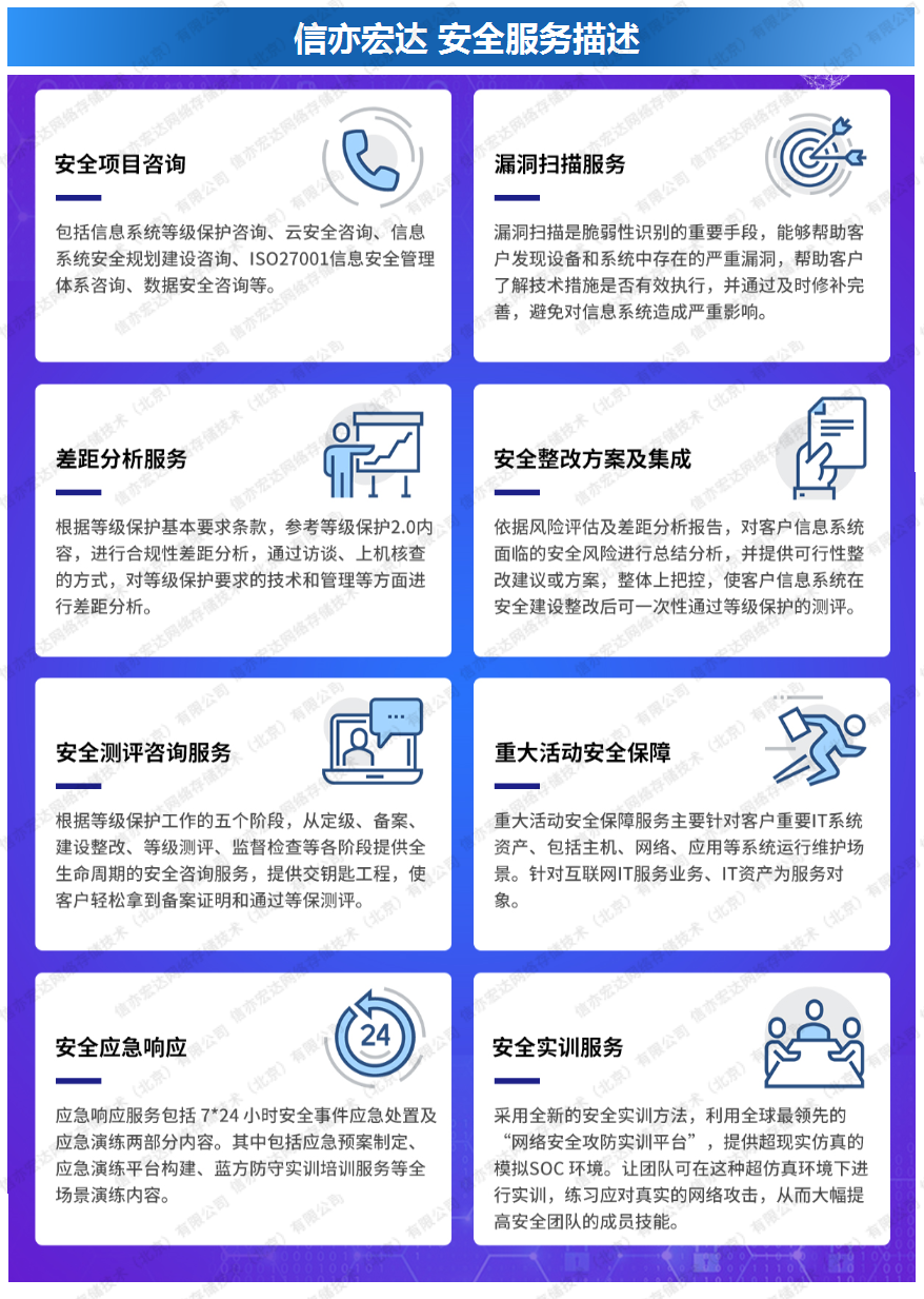 信亦宏达始终坚持以技术为先导,以满足用户需求为服务准则,为用户提供专业的方案咨询、项目实施、系统维护、应急响应等服务,并不断潜心关注、研究新的IT技术发展方向,持续提升方案集成及服务能力。