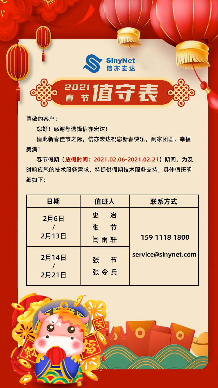 2021年新春佳节将近,根据国家法定假期规定,结合信亦宏达实际情况与工作安排,现将我司春节放假安排公布如下: