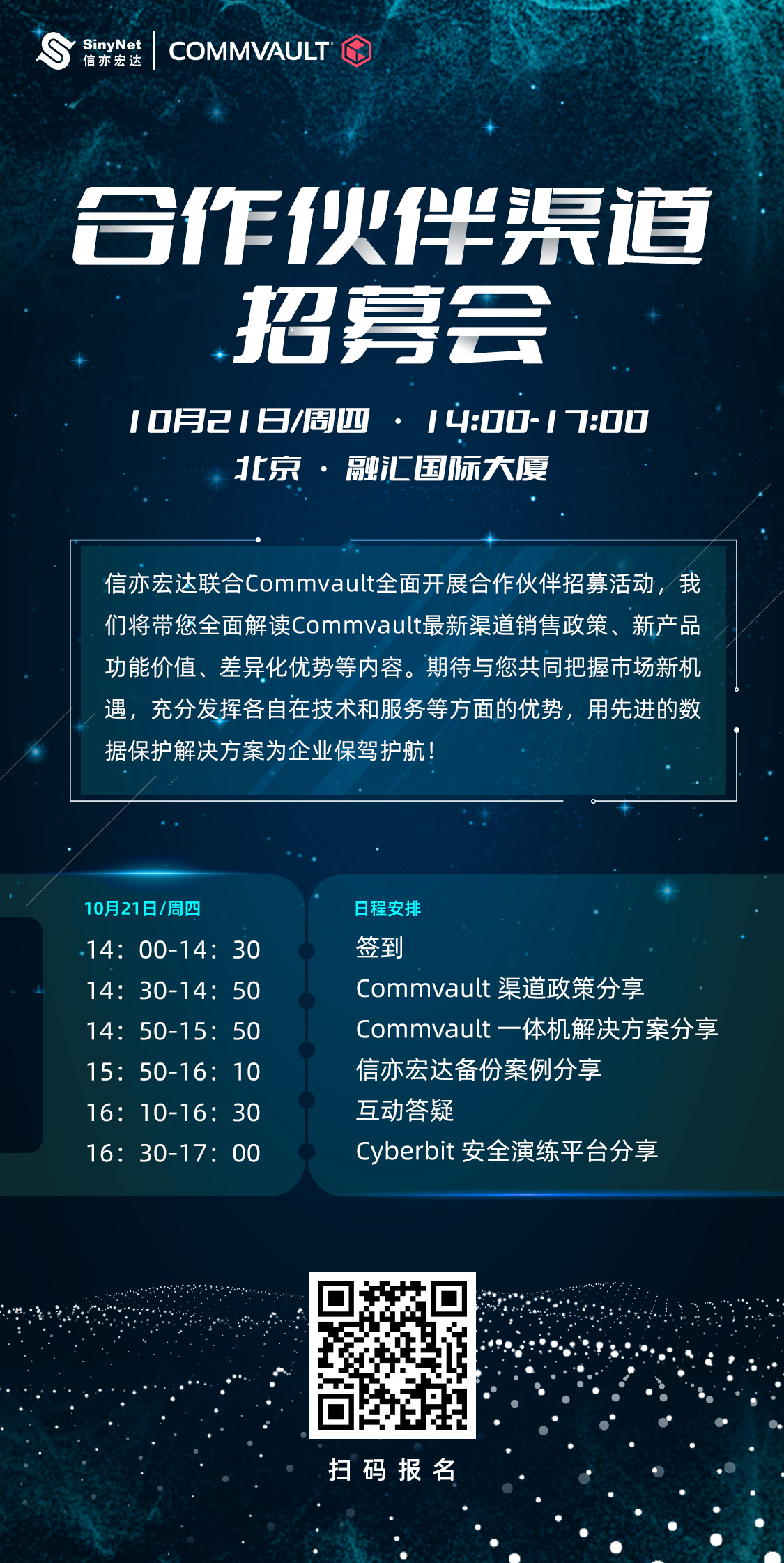 首站—北京,即将于10月21日开启!会上将有来自网络安全攻防演练领域佼佼者 Cyberbit 及全球知名企业级数据备份恢复及管理厂商Commvault 的资深讲师为大家分享市场新的机遇与挑战、如何管理企业数据并将其价值最大化,如何提升网络安全人才能力等内容。信亦宏达真诚邀您前来深入交流、探讨,共谋新技术、新变革下的市场前进动向!