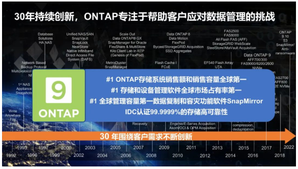 ONTAP由联想凌拓母公司之一的NetApp于1992年首次推出,尹伟介绍,诞生至今,ONTAP历经30年的市场考验,在持续的技术创新中始终为客户提供现代化的智能数据管理技术。推出至今,ONTAP销售额、销售容量、软件管理、数据复制容灾等多项技术表现名列前茅,收获了行业客户及权威机构的广泛认可。