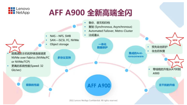 今年,联想凌拓母公司之一NetApp推出了最新全闪存系统阵列组合产品——NetApp AFF A900。全新AFF A900由NetApp ONTAP企业版驱动,可为企业机构提供更极致的性能,如超高速的主机和存储连接速度、更高的系统性能;一如既往的多协议支持,包括对SAN、NAS和object storage的统一支持;备份、容灾等一体化的数据保护,更好地满足企业数据管理的持续性要求;集成的防勒索病毒软件,具备自主学习功能,以便帮助企业灵活应对未来不断变化的勒索病毒威胁。凭借强劲的产品性能及多元化功能,AFF A900也在此次峰会中荣获2022年度闪存创新产品技术奖。