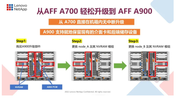 为打造面向未来的高端存储系统,AFF A900在性能、关键特性上与上一代产品相比,均有50%左右的提升,满足用户高业务需求。软件上,AFF A900可作为整体的企业存储解决方案,同时满足了高性能和弹性的业务需求。此外,AFF A900防勒索病毒软件包集多功能于一体,多维度保障用户的数据安全。随后,尹伟还详细介绍了如何从A700顺利升级到A900,保证以用户需求为中心,实现了更优质的性能及使用体验。