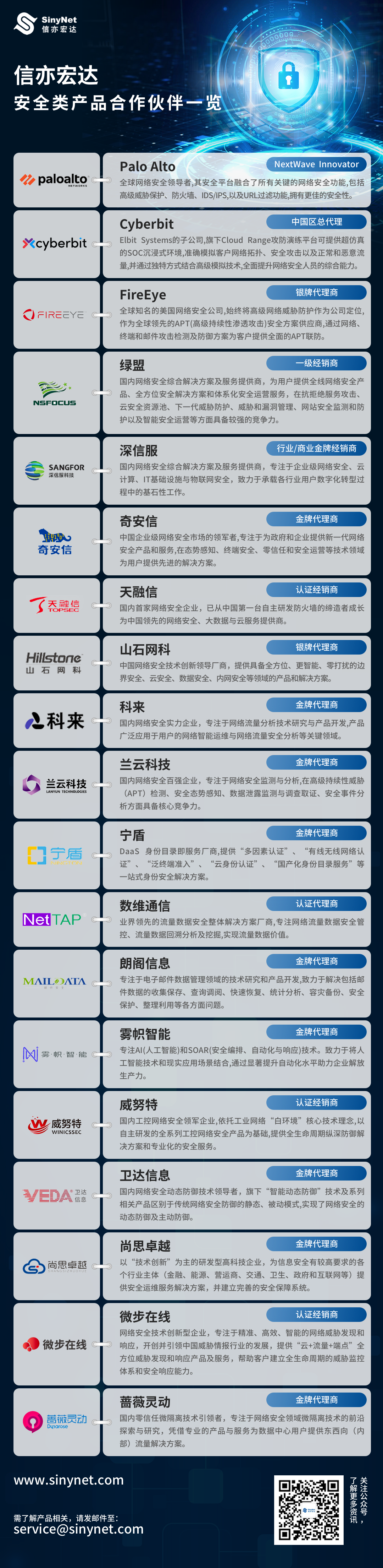 为让大家更加清晰地了解信亦宏达业务方向,我们将从数据、安全及服务三大块,来为大家介绍信亦宏达最新产品线。本周所示内容为安全类产品,欢迎大家转发、收藏!详细内容见下图!