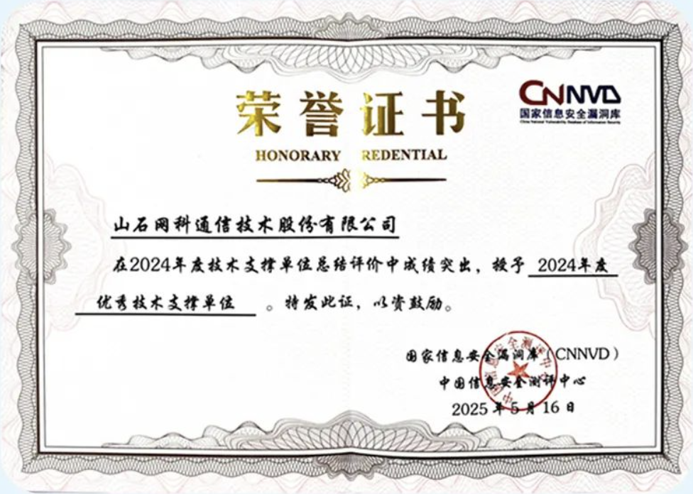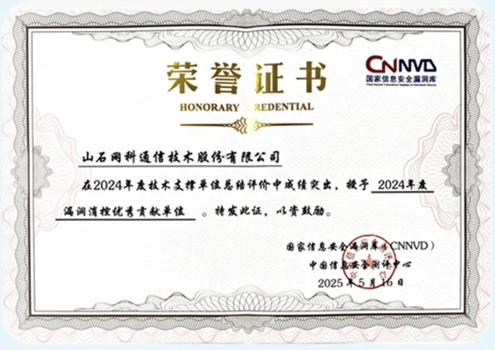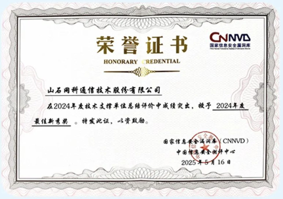 近日,国家信息安全漏洞库(CNNVD)2024 年度工作总结暨优秀支撑单位表彰大会在中国信息安全测评中心召开。山石网科凭借在漏洞发现、分析与报送等工作中的突出贡献,一举斩获"优秀技术支撑单位"、"漏洞消控优秀贡献单位"、"最佳新秀奖"等多项荣誉,彰显了在网络安全漏洞管理领域的卓越能力。