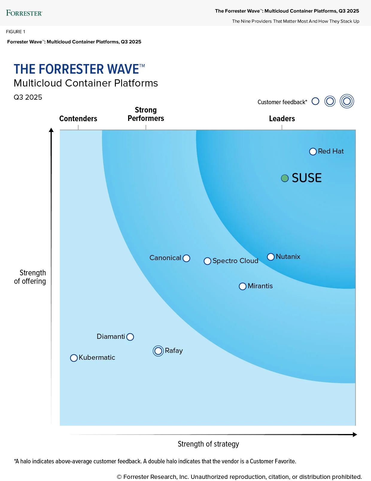 在独立调研机构 The Forrester Wave™ 举办的 2025年第三季度“多云容器平台评测”报告中,SUSE 在 21 项评估标准中获得最高分,被评为该领域最高的“领导者”称号,跻身顶级多云容器平台提供商行列。