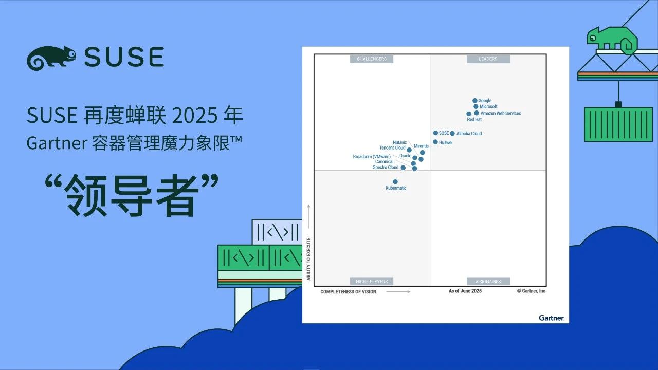 好消息!在刚刚发布的 Gartner® 2025 年度《容器管理魔力象限™》报告中,SUSE 凭借其在容器管理领域清晰的发展愿景、技术实力和市场表现力,再度蝉联该领域的最高荣誉——“领导者”称号。