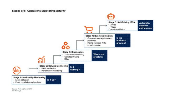 报告中,Gartner将IT运营管理(ITOM)成熟度由低到高分为五个阶段: