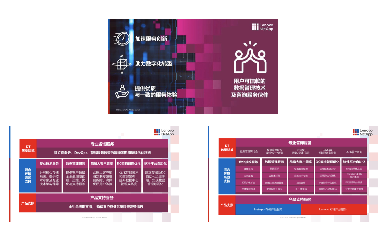 服务是联想凌拓的核心竞争力之一。作为用户可信赖的数据管理技术及咨询服务伙伴,联想凌拓一直通过全方位的专业咨询服务、混合环境高效支持及产品支持服务赋能企业数字化转型。新财年,联想凌拓将持续践行关注客户(Customer Focus)的企业文化,以更灵活的策略,优化与创新服务类别,不断提供有价值的专业服务。