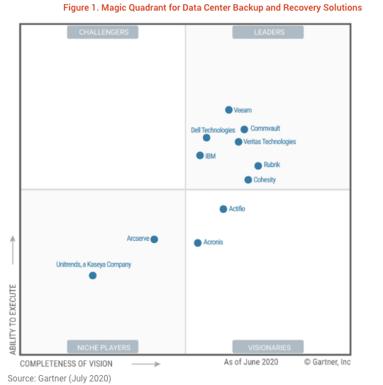 Commvault公司是数据备份与恢复领域的领导者,其产品的能力得到世界公认。根据Gartner最新发布的《2020年数据中心备份恢复解决方案魔力象限》显示,Commvault连续第9次处于领导者象限。
