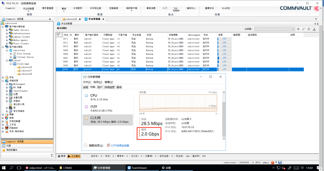 为了验证备份的能力,XSKY和Commvault在北京搭建了一个海量小文件备份测试环境,发现多任务并发场景下,备份速度可达220MB/s左右,约每秒备份4500个50KB对象,每天24小时可备份18TB数据,约3.8亿个对象。由于Commvault支持永远增量备份模式,该性能基本能够满足大多数企业的海量文件备份需求。