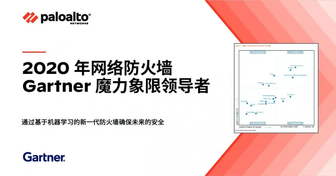 全球领先IT研究和咨询公司Gartner发布《2020年全球网络防火墙魔力象限报告》。该报告连续9年认可Palo Alto Networks(派拓网络)为网络防火墙领导者,稳坐“前瞻性”坐标最远位置,以及“执行力”坐标最高位置。
