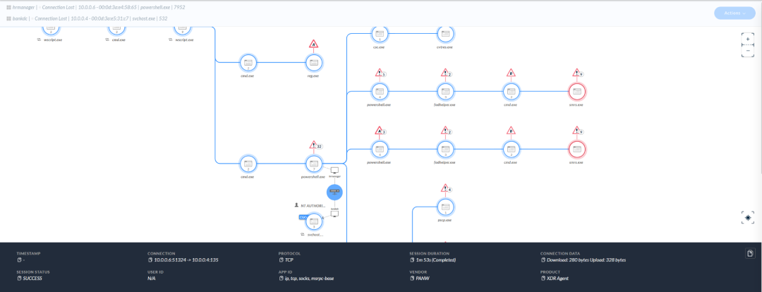 Cortex XDR 将网络和端点数据整合在一起,以提供更多详细信息,例如以上所示针对网络连接的 App-ID“msrpc-base”,以便分析人员全面掌握攻击。