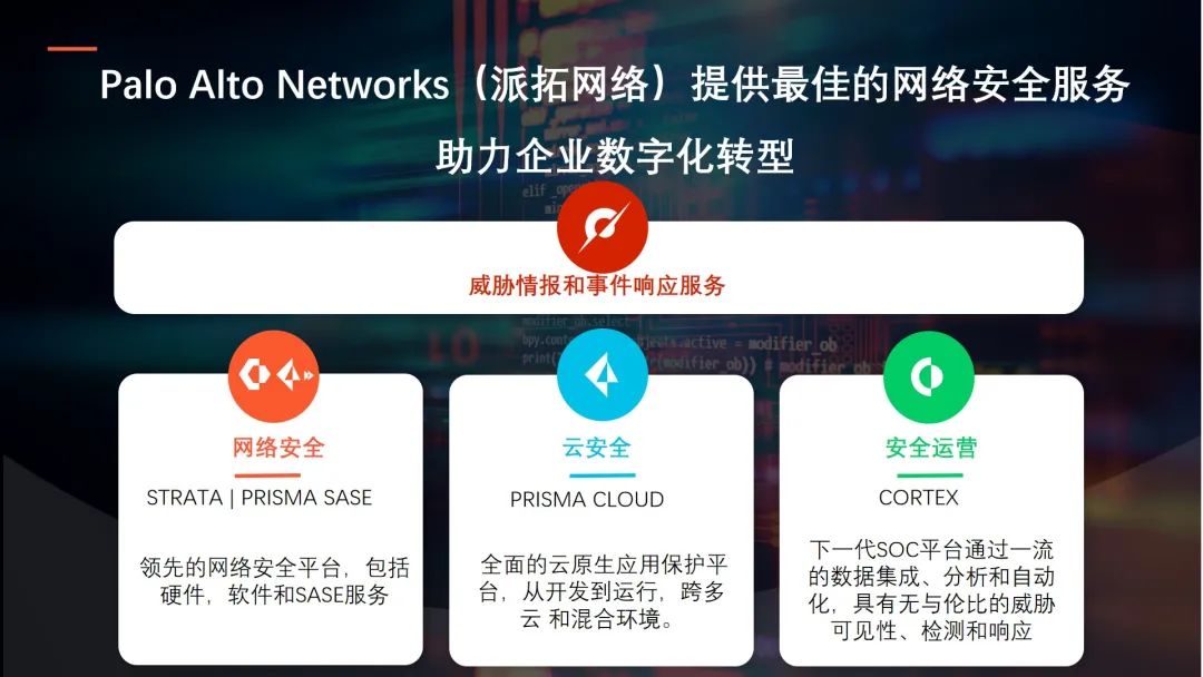 Palo Alto Networks(派拓网络)下一代安全产品:网络安全+云安全+安全运营,三大平台协同发力,让安全能量持续攀升。
