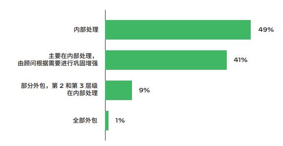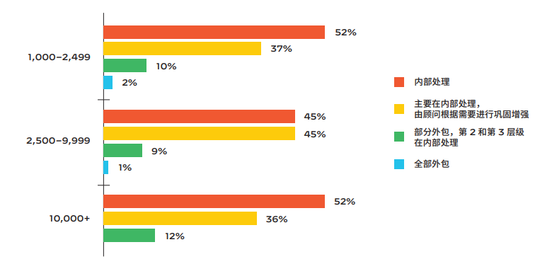 近一半 (49%) 的受访者表示企业在内部处理事件响应。只有 1% 的企业会将其完全外包。在大多数情况下,公司会选择自己处理安全事件。一个有趣的发现是,对于不同规模的企业,内部处理和外包的事件响应比例一致。按企业规模划分的内部处理与外包事件响应的百分比显示每个企业规模分组的结果都与整体结果几乎相同。
