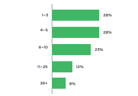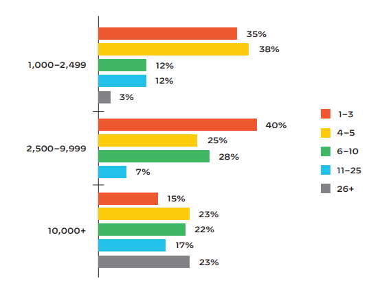 即使是大公司也会雇佣小型事件响应团队。在员工人数介于 1,000 到 2,499 之间的企业中,有 35% 的企业配备了 1 到 3 人的团队,这不足为奇。令人震惊的是,在员工人数超过 10,000 的企业中,有15% 的企业配备的团队也是 1 到 3 人。