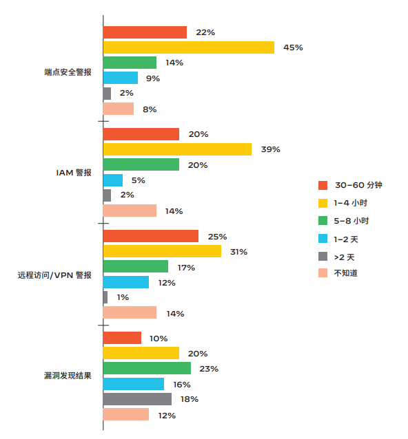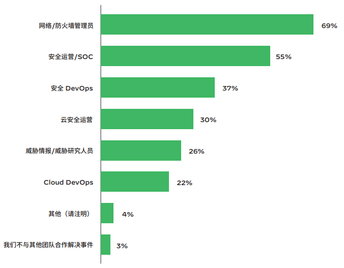 事件响应是一项多团队合作任务。调查显示,事件响应团队在处理安全事件时必须在整个企业内开展广泛协作。在他们不得不与之互动的一些团队里,有一部分缺乏安全性。受访者需要与许多其他群体保持联系并与他们协调活动,这进一步表明小型事件响应团队的压力巨大。