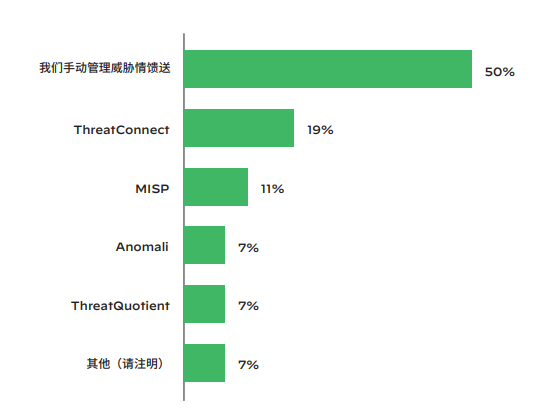 一半的受访者采用手动方式管理威胁情报源。另一半受访者则使用各种各样的威胁情报源管理工具, 对于如此关键的工作流程来说,50% 是一个很高的数字,尤其是考虑到当今一些威胁的严重程度。对于小型团队而言,存在因进行威胁管理而导致安全人员超负荷工作的风险。同时,公司也面临着错误处理安全警报的风险。