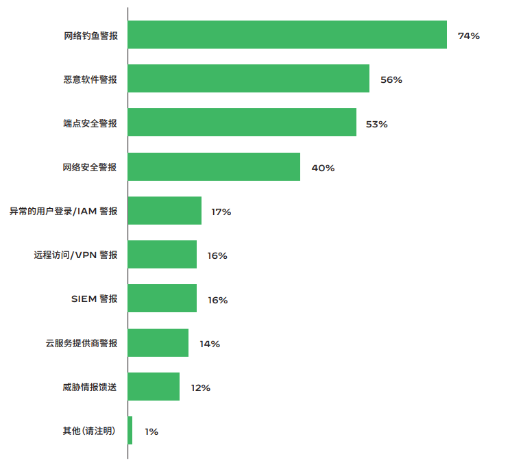 当被问及他们的团队必须处理的三种数量最多的事件类型时,74% 的受访者表示是网络钓鱼警报。56% 的受访者选择了恶意软件警报,53% 的受访者选择了端点安全警报。