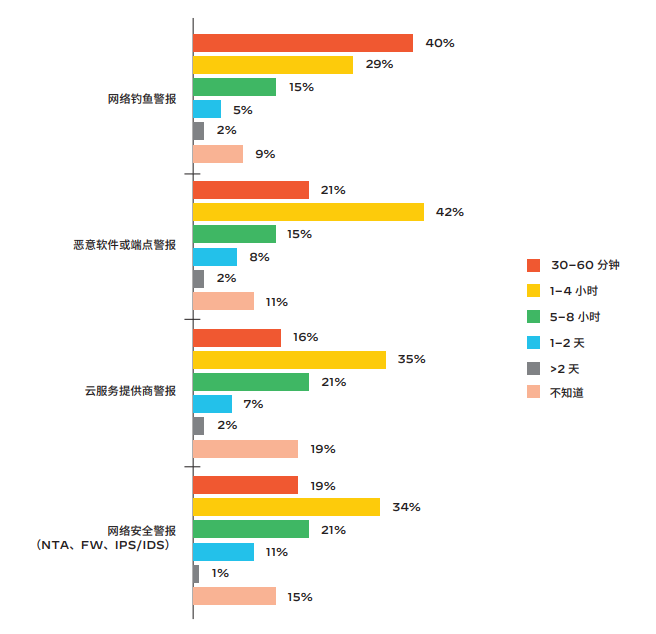 自动化的速度似乎滞后于事件加载速度。例如,28% 的受访者已自动化网络安全运营,但 40% 的受访者将其列为数量最多的前 3 大事件类型。74% 的受访者将网络钓鱼警报列为数量最多的前 3 个事件之一,但只有 37% 的受访者已自动化网络钓鱼事件响应流程。