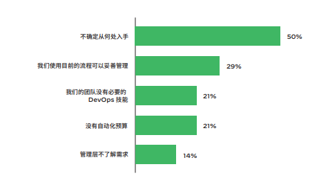 “不确定从何处入手”是未部署安全自动化的首要原因,50% 的受访者表示这是他们最大的障碍。21% 的受访者认为,缺乏预算和必要的技能是实现自动化的阻碍因素。因此,五分之四的受访者显然不存在缺少实现自动化所需的资金或训练有素的人员的情况。14% 的受访者表示管理层不了解这种需求。29% 的受访者表示他们“使用目前的流程可达到很好的管理效果”。
