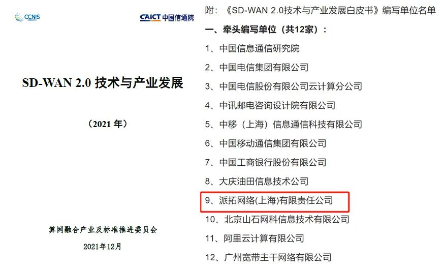 业界权威报告!近日,Palo Alto Networks(派拓网络)参与编制的《SD-WAN 2.0技术与产业发展白皮书》(以下简称“《白皮书》”)由中国通信标准化协会算网融合产业及标准推进委员会、中国信通院重磅发布。作为SD-WAN发展研究的最新权威成果,《白皮书》全面呈现SD-WAN 2.0发展面貌,旨在为产业各方提供深度观察和应用实践的重要参考。Palo Alto Networks(派拓网络)作为主要参编单位之一,为《白皮书》提供了理论、技术及实践支持,表明Palo Alto Networks(派拓网络)在SD-WAN领域正凭借领先的技术实力与影响力,为行业的标准化建设贡献价值。